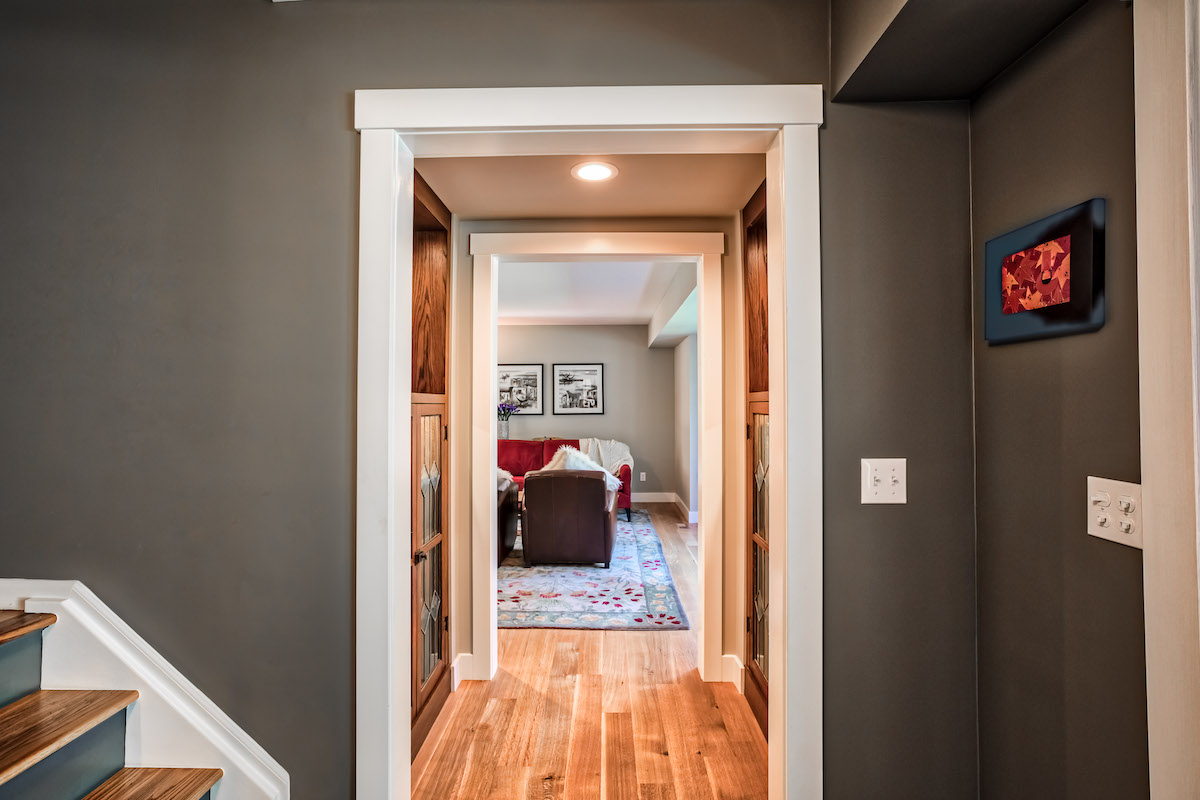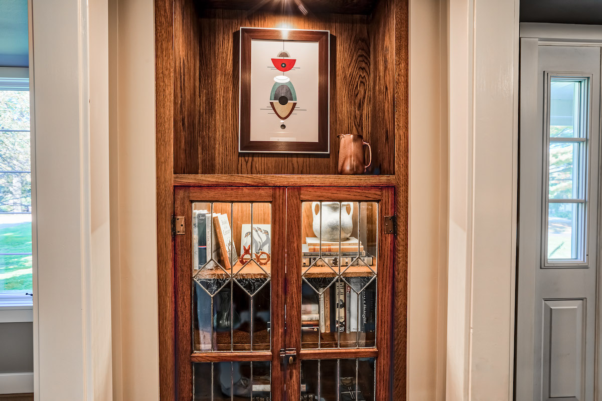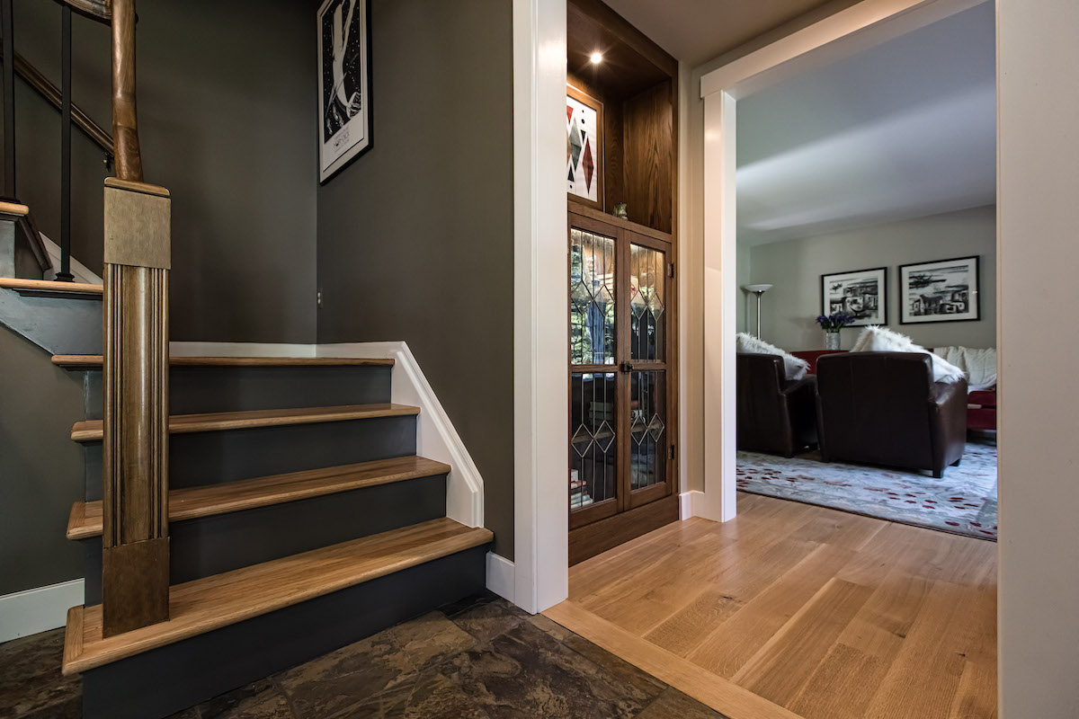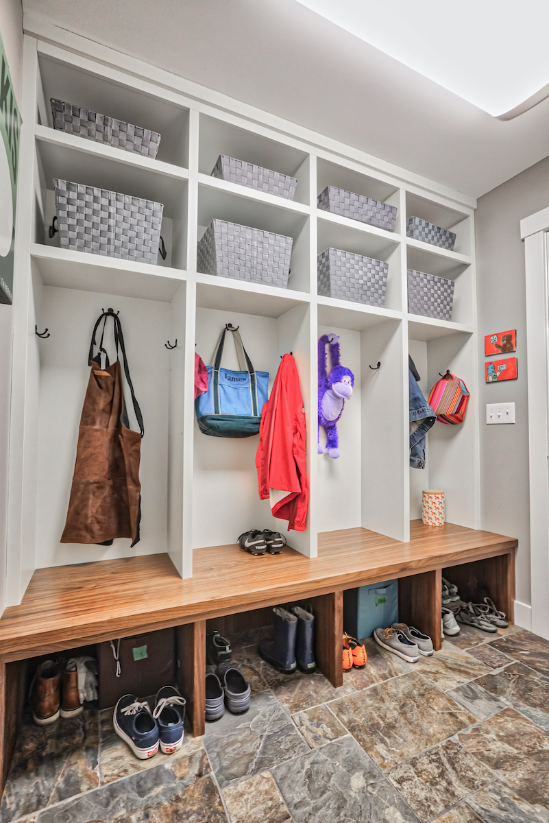 By stealing space from the large living room and family room, our designers knew they could come up with solutions that would help our clients get the functions they needed. The existing living room was large and wasn't a room that was regularly used, thus losing some square footage wouldn't be missed. By doing this our designers were able to add a storage pantry to the kitchen and create a unique transition hall with custom bookcases that showcased leaded glass doors that were family heirlooms. Ditto for the large family room space - losing just a few square feet created the perfect drop-zone to manage the day-to-day clutter.