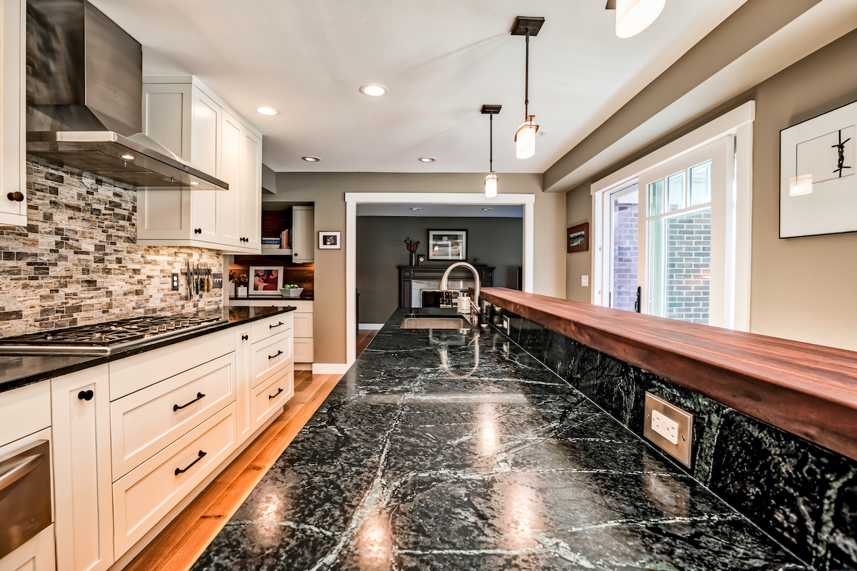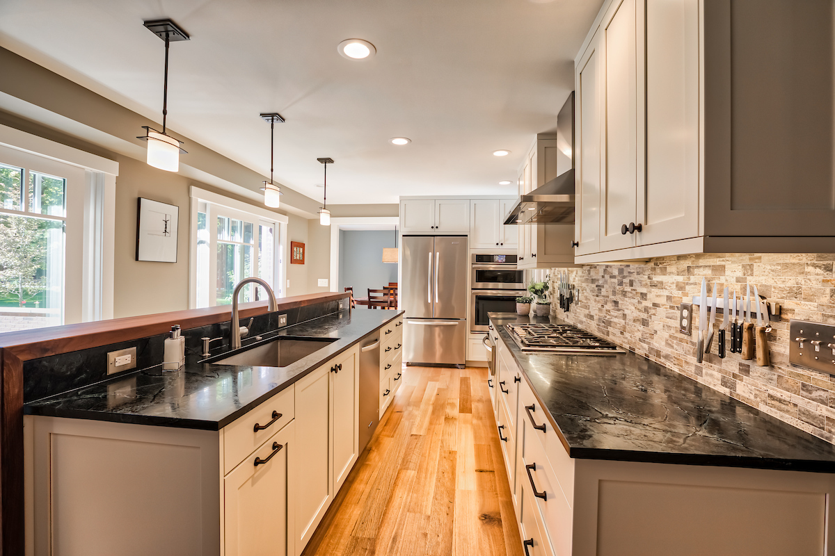 Opening up the flow to adjoining first-floor rooms allows the owners to engage with their teenage children while still doing what they love – cook! The wall of glass sliders along the back wall floods the kitchen with natural light, showcases the beautiful wooded lot and creates the perfect party space for large gatherings.
